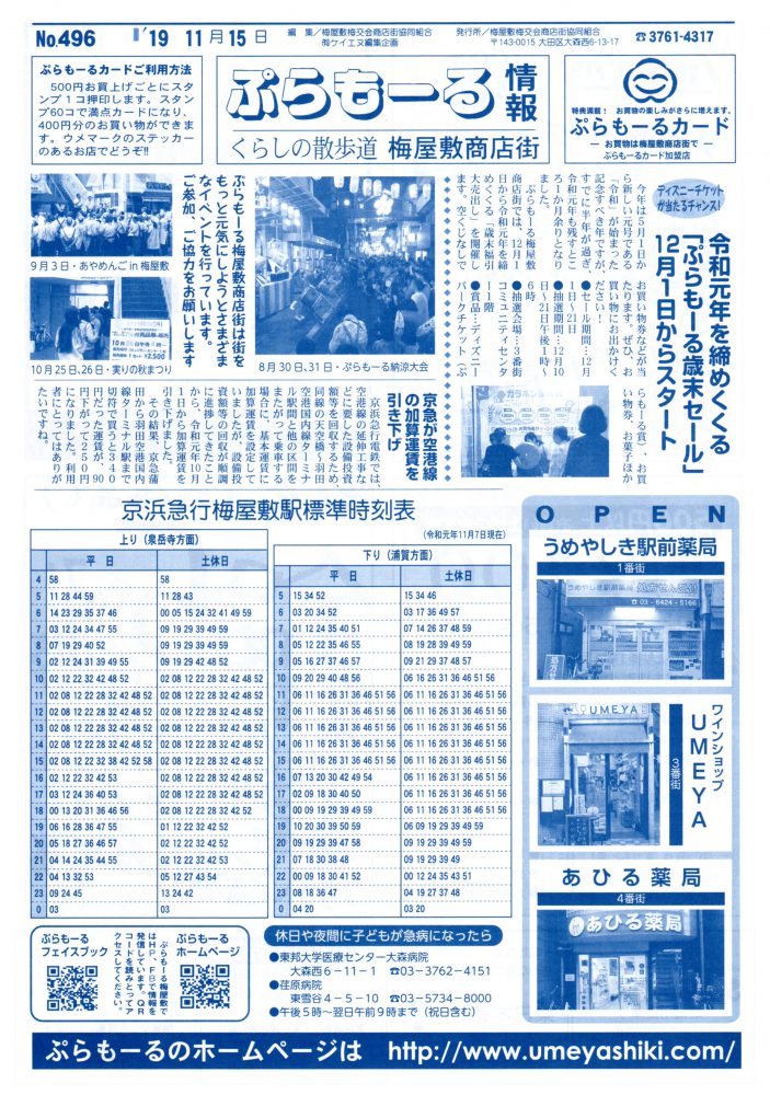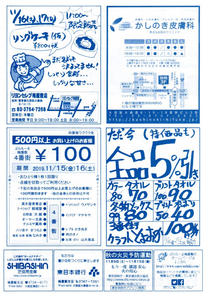 「ぷらもーる情報」は、新聞折込にて各ご家庭に配布させていただいております。掲載店の広告には、割引券などを切り取って使用するお得な広告もあります。11/15(金)より梅屋敷コミュニティーセンターにご用意していますのでご自由にお持ち帰りください。いつもご覧いただきましてありがとうございます。 次号は2019年11/29(金)です。