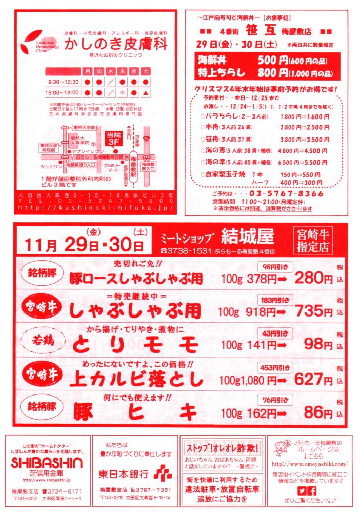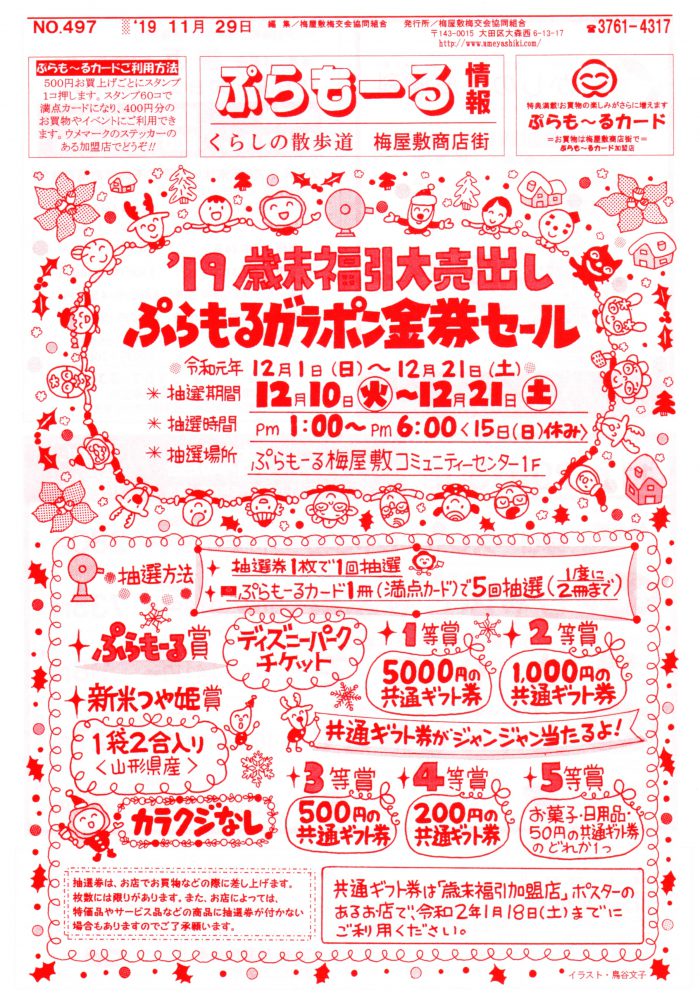 「ぷらもーる情報」は、新聞折込にて各ご家庭に配布させていただいております。掲載店の広告には、割引券などを切り取って使用するお得な広告もあります。11/27(水)より梅屋敷コミュニティーセンターにご用意していますのでご自由にお持ち帰りください。いつもご覧いただきましてありがとうございます。 次号は2019年12/6(金)です。