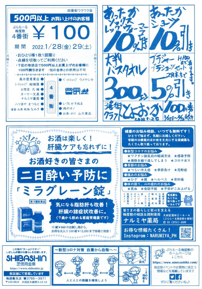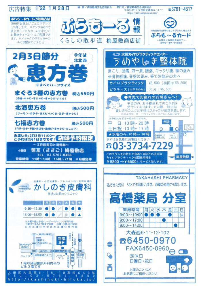 いつもご覧いただきましてありがとうございます。 本年もどうぞよろしくお願い致します。 「ぷらもーる情報」は、新聞折込にて各ご家庭に配布させていただいております。 1/28(金)より梅屋敷コミュニティーセンターにもご用意していますので ご自由にお持ち帰りください。次号は2022年2/25(金)です!