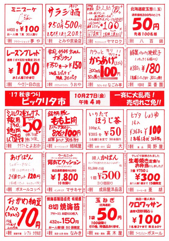 20店のお店の前で自慢の逸品を一斉に大乱売します。
